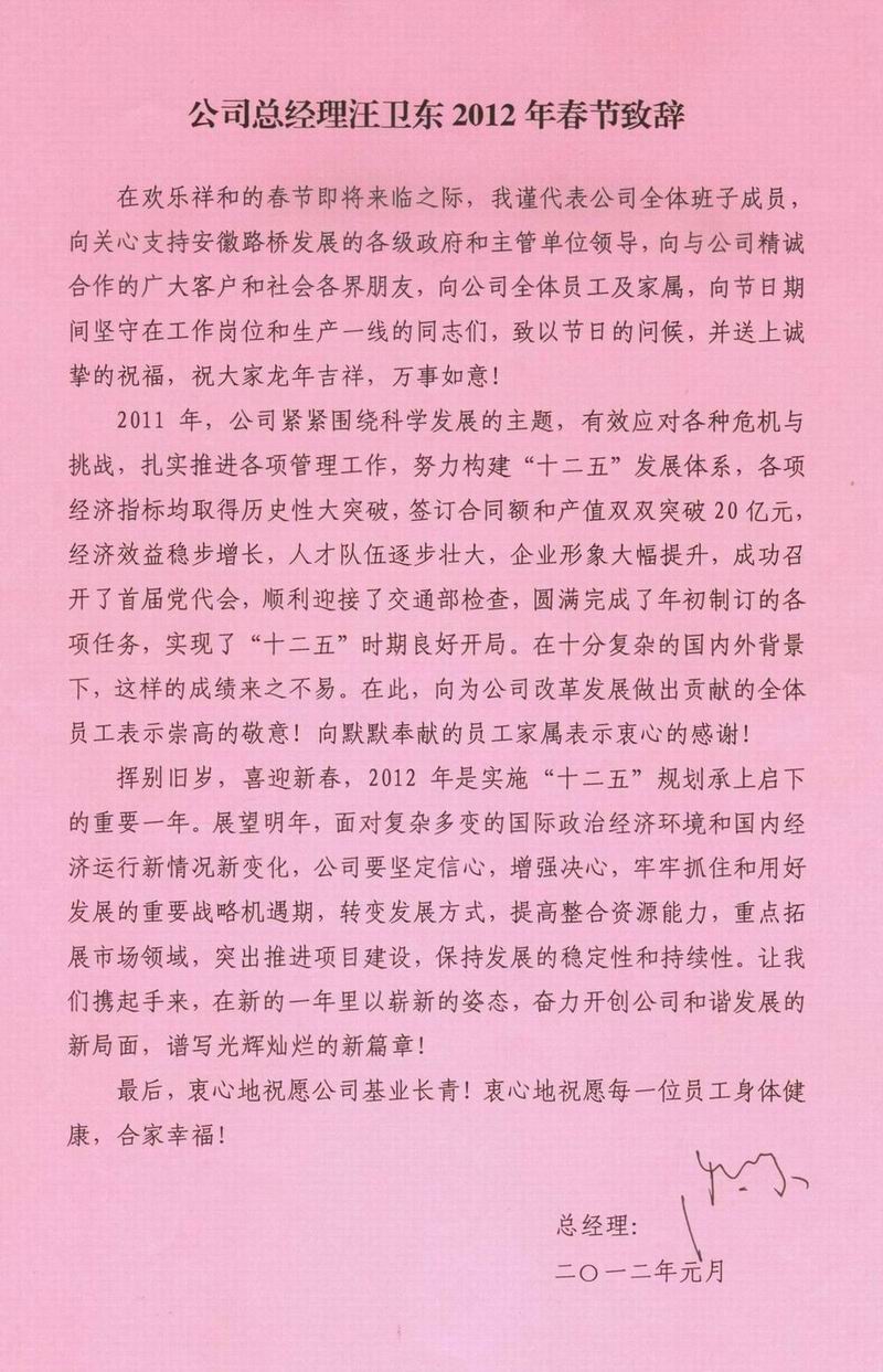 公司總經理汪衛(wèi)東2012年春節(jié)致辭