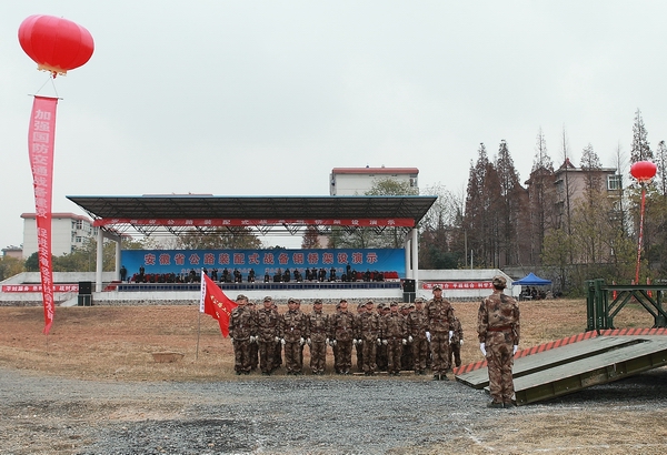 下午,在合肥警備區(qū)教導(dǎo)隊(duì)訓(xùn)練場(chǎng),紅旗招展,彩球飄揚(yáng)。公司從各單位、各項(xiàng)目抽調(diào)的50名隊(duì)員經(jīng)過(guò)為期一周的軍事化訓(xùn)練,精神抖擻、整裝待發(fā)。15:00時(shí),演示活動(dòng)正式開(kāi)始。隨著梅廳長(zhǎng)一聲令下,隊(duì)員們高舉“安徽省公路工程保障大隊(duì)”旗幟,齊喊口號(hào),跑步進(jìn)入現(xiàn)場(chǎng),開(kāi)始架設(shè)。在架設(shè)的同時(shí),進(jìn)行了現(xiàn)場(chǎng)同期聲解說(shuō)。短短30分鐘內(nèi),隊(duì)員們分工明確,技術(shù)熟練,配合默契。在沒(méi)有機(jī)械設(shè)備的情況下,依靠人工肩扛手抬,迅速完成了桁架、橋面板等搭設(shè),將鋼橋推過(guò)河,隨后三輛炮車(chē)緩緩?fù)ㄟ^(guò),進(jìn)行裝備通載檢驗(yàn)。至此,戰(zhàn)備鋼橋架設(shè)演示圓滿(mǎn)完成。演示活動(dòng)結(jié)束后,領(lǐng)導(dǎo)們上橋檢閱,親切地接見(jiàn)、慰問(wèn)了參演隊(duì)員,并合影留戀。