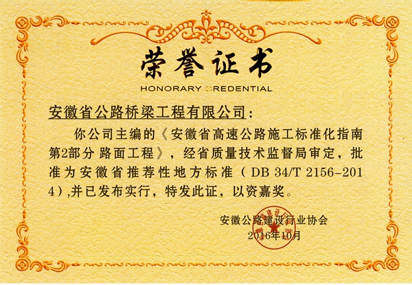 會上,省交通廳對在系列指南編寫工作中作出貢獻的單位和個人給予了表彰并頒發(fā)榮譽證書。公司主編的 《安徽省高速公路施工標(biāo)準(zhǔn)化指南  第2部分路面工程》(DB 34/T 2156-2014)獲得表彰,并經(jīng)省質(zhì)量技術(shù)監(jiān)督局審定批準(zhǔn)為安徽省推薦性地方標(biāo)準(zhǔn),發(fā)布實行。