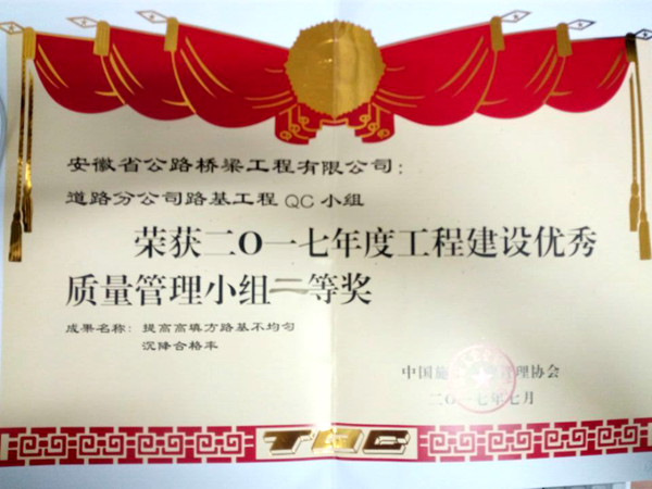 近日,在中國(guó)施工企業(yè)協(xié)會(huì)2017年度全國(guó)工程建設(shè)質(zhì)量QC小組成果發(fā)布暨評(píng)審會(huì)上,由道路分公司QC小組選送的《提高高填方路基不均勻沉降合格率》成果,從全國(guó)千余個(gè)QC成果中脫穎而出,以優(yōu)異的成績(jī)榮獲2017年度工程建設(shè)優(yōu)秀質(zhì)量管理小組成果二等獎(jiǎng),為公司贏得了榮譽(yù)。