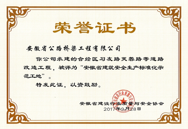 這是公司自去年開全省市政路橋工程先河,一次性獲得五個省級安全標(biāo)準(zhǔn)化示范工地后,再次獲得這一榮譽(yù)。