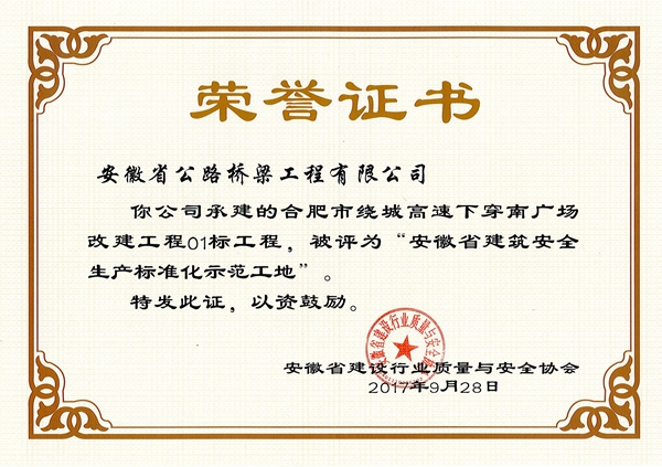 近日,從安徽省建設(shè)行業(yè)質(zhì)量與安全協(xié)會獲悉,由公司承建的合肥市繞城高速下穿南廣場改建工程01標(biāo)、合經(jīng)區(qū)習(xí)友路芙蓉路等道路改造工程兩個項(xiàng)目榮獲“安徽省建筑安全生產(chǎn)標(biāo)準(zhǔn)化示范工地”稱號。