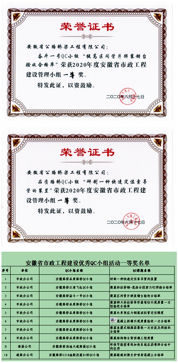 公司10項(xiàng)QC成果榮獲安徽省市政工程建設(shè)優(yōu)秀QC小組活動(dòng)一等獎(jiǎng)