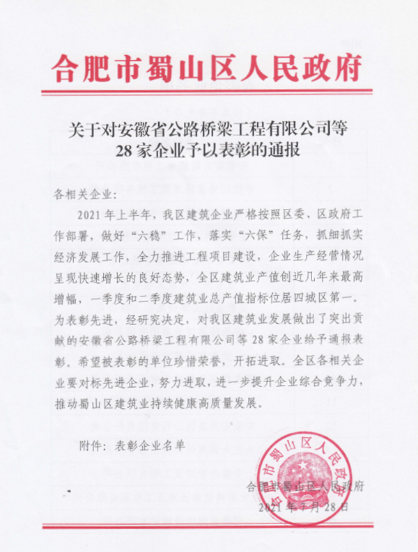 上半年,公司認(rèn)真謀劃、統(tǒng)籌部署,堅(jiān)持疫情防控和生產(chǎn)經(jīng)營兩手抓、兩手硬,積極做好“六穩(wěn)”工作、嚴(yán)格落實(shí)“六?!比蝿?wù),企業(yè)生產(chǎn)經(jīng)營情況始終保持增長態(tài)勢(shì),為蜀山區(qū)建筑業(yè)總產(chǎn)值指標(biāo)上半年位居全市首位做出了突出貢獻(xiàn),為此,蜀山區(qū)人民政府對(duì)公司給予通報(bào)表彰。下一步,公司將珍惜榮譽(yù),緊緊圍繞“十四五”戰(zhàn)略規(guī)劃,進(jìn)一步提高競爭力,持續(xù)推進(jìn)品質(zhì)路橋卓越路橋建設(shè),為推動(dòng)蜀山區(qū)建筑業(yè)高質(zhì)量發(fā)展作出新的更大貢獻(xiàn)。