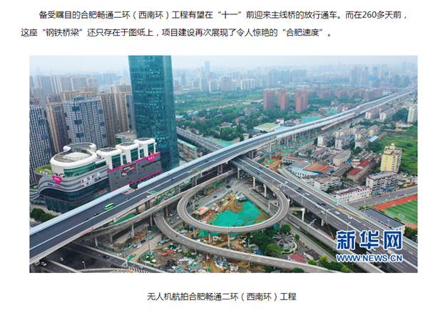 8月28日,國家級(jí)主流媒體再次聚焦公司承建的重點(diǎn)工程建設(shè),《新華網(wǎng)》以《“飛閱”中國260天 見證“合肥速度”》為題,報(bào)道了公司承建的暢通南二環(huán)(西南環(huán))項(xiàng)目建設(shè)進(jìn)展情況。
