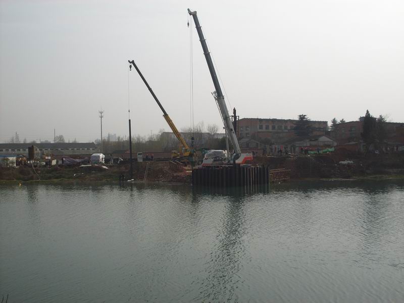淠望路大橋作為市政工程具有工期緊、任務(wù)重、技術(shù)難度大的特點,但經(jīng)項目部領(lǐng)導精心組織、科學部署,加大人力與設(shè)備的投入,自2月1日進場開工以來,全部90根挖孔樁已開挖41根,累計深度270m;于2月18日開始進行關(guān)鍵工序——主墩右幅鋼板樁圍堰施工。由于淠史杭干渠承擔皖豫兩省14個縣(區(qū))的春耕灌溉任務(wù),六安市重點辦要求加快施工進度,必須在4月15日完成所有水下工程及用于水面以上施工的支撐等,并于4月25日前完成圍堰拆除清理工作。項目部立即召開緊急動員會,號召全體技術(shù)人員克服一切困難和挑戰(zhàn),堅決完成上級交代的任務(wù),并立即組織技術(shù)人員根據(jù)鋼板樁長度、水深、地質(zhì)、承臺埋置深度等情況,制定了科學的施工技術(shù)方案、成立了以項目部經(jīng)理、副經(jīng)理為組長的安全領(lǐng)導小組。施工所用的T90振動錘、70t吊車、25t吊車、PC200挖機、 T100推土機、ZLM50裝載機、自卸車等重型機械設(shè)備陸續(xù)開進施工現(xiàn)場。