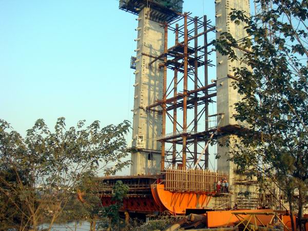 六安淠望路大橋主跨長120米,共有15個(gè)節(jié)段,最大節(jié)段長10米,寬35米,重410噸。普通節(jié)段長7米、寬27米、重300噸。由于節(jié)段長、重量大,普通掛籃不能滿足施工要求,按設(shè)計(jì)要求采用前支點(diǎn)掛籃,掛籃的前端支點(diǎn)利用斜拉索掛制于索塔。施工過程中前點(diǎn)荷載均由斜拉索承受,澆注混凝土?xí)r,通過調(diào)整索力來調(diào)整掛籃高程。本項(xiàng)目采用的前支點(diǎn)掛籃,掛籃長18米、寬30米、重166噸,此種掛籃施工工藝在公司尚屬首次。