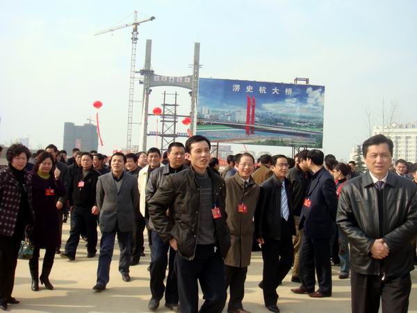 在大橋南端,代表委員們聽取了業(yè)主負責(zé)人六安市建委副主任曹德林關(guān)于大橋的相關(guān)介紹。當(dāng)曹主任介紹到自2009年2月1日開工以來,項目部緊緊圍繞工程目標,編排工期、制定方案,狠抓落實;全體員工凝心聚力、攻堅克難,確保各項目標任務(wù)順利完成,預(yù)計4月初主跨即可合攏時,代表委員們不由地驚嘆起來。