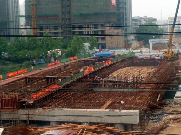 宋斗灣路工程跨南淝河橋在330日左半幅鋼管樁打設(shè)完畢后,就開始著手進(jìn)行貝雷架和支架搭設(shè)作業(yè)。在左半幅支架搭設(shè)、模板鋪裝和鋼筋安裝施工的同時(shí),跨南淝河橋右半幅的鋼管樁打設(shè)作業(yè)和支架搭設(shè)作業(yè)也初步完工。至此,宋斗灣路工程跨南淝河橋的上部結(jié)構(gòu)的支架搭設(shè)基本完工。下一步,箱梁內(nèi)膜安裝結(jié)束后,項(xiàng)目部將組織橋梁主體混凝土澆注工作。