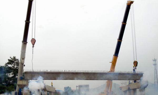 此次梁板架設(shè)方案經(jīng)我部反復(fù)討論,還專門舉行了梁板架設(shè)安全技術(shù)交底會(huì),并上報(bào)了專項(xiàng)技術(shù)和安全方案?,F(xiàn)場吊裝作業(yè)的隊(duì)伍也是我部特別選用的一支有多年梁板架設(shè)經(jīng)驗(yàn)的專業(yè)隊(duì)伍。在抓生產(chǎn)進(jìn)度的同時(shí),確保安全防范及時(shí)跟上。