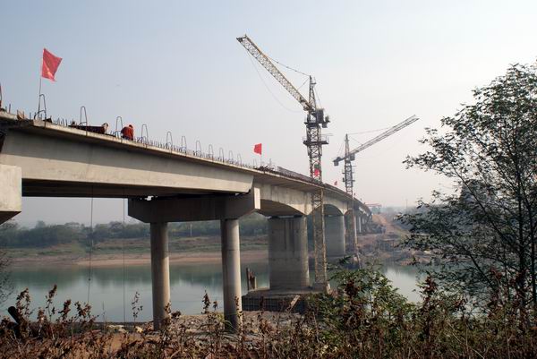 青弋江大橋全長454米,凈寬11米,結(jié)構(gòu)形式為30×10+70+42×2的簡支箱梁與現(xiàn)澆懸臂橋。該工程于2007年開工,前期由于施工條件的限制和其它不利因素,工程進(jìn)展頗不順利。后來在公司領(lǐng)導(dǎo)的大力支持下,全體施工人員上下合力,積極創(chuàng)造條件進(jìn)行施工,全橋終于順利合龍。盛總在合龍現(xiàn)場指出,雖然大橋已順利合龍貫通,但后期任務(wù)還相當(dāng)艱巨,橋面、護欄、橋頭搭板和護坡等都需要抓緊施工,在保證質(zhì)量、保證安全的情況下,組織力量加快施工進(jìn)度,確保實現(xiàn)元月通車的目標(biāo)。