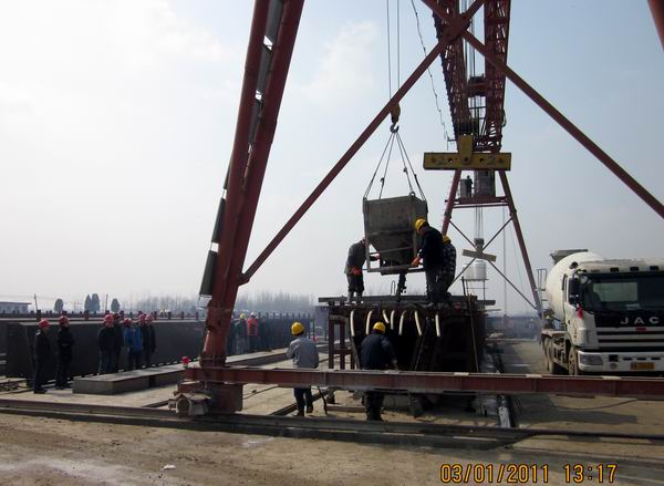 為確保此次箱梁澆筑過(guò)程萬(wàn)無(wú)一失,項(xiàng)目部精心制定澆筑施工方案,提前做好各項(xiàng)準(zhǔn)備工作。項(xiàng)目部對(duì)澆筑設(shè)備及混凝土進(jìn)行反復(fù)檢驗(yàn),制定應(yīng)急預(yù)案,要求全體人員在澆筑過(guò)程中樹立高度的責(zé)任心,保證整個(gè)澆筑過(guò)程安全、有序。隨著砼灌車進(jìn)入梁場(chǎng),試吊、起吊、前移、就位、澆筑,一串協(xié)調(diào)而又連貫的運(yùn)作之后,第一片箱梁成功澆筑。