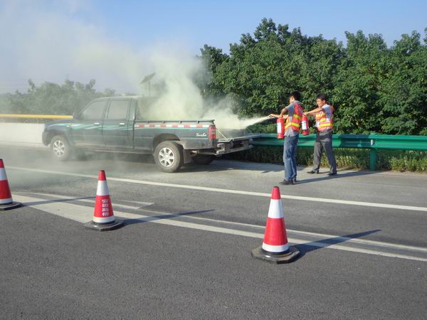 1640,隨著蕪宣高速公路管理公司副總經(jīng)理郭建華的一聲令下,蕪宣養(yǎng)護(hù)項(xiàng)目組織開展的突發(fā)交通事故處置聯(lián)合演練開始。16時(shí)45分,事故車輛撞向錐標(biāo),沖入封閉區(qū)并撞壞護(hù)欄。1646,巡標(biāo)員發(fā)現(xiàn)事故,立刻補(bǔ)齊被撞倒錐標(biāo),并向項(xiàng)目安全環(huán)保部負(fù)責(zé)人報(bào)告;同時(shí)安排其他巡標(biāo)員到事故車輛后方搖旗警示。1648,項(xiàng)目安全環(huán)保部負(fù)責(zé)人李剛就事故情況報(bào)告監(jiān)控中心,并向項(xiàng)目應(yīng)急救援小組組長曹祝林匯報(bào)事故情況。1654,蕪湖市高速交警一大隊(duì)巡警及施救組趕到事故現(xiàn)場,組織對(duì)駕駛員進(jìn)行營救。1655,施救組成員對(duì)受傷駕駛員傷口進(jìn)行消毒、包扎。1657,事故車輛起火。1658,項(xiàng)目應(yīng)急救援小組成員對(duì)事故車輛進(jìn)行滅火。1702,路政部門到達(dá)現(xiàn)場,對(duì)事故車輛進(jìn)行勘察,并向陪乘人員了解事故情況及駕駛員情況。1711,對(duì)蕪宣方向車輛進(jìn)行管制。1734,清障車在未知情情況下進(jìn)入事故現(xiàn)場,對(duì)事故車輛進(jìn)行施救。1739,蕪宣方向交通開放,在交警、路政、項(xiàng)目巡標(biāo)員的指揮下緩慢行走。1741,清掃組對(duì)事故現(xiàn)場的拋灑物、撞壞的錐標(biāo)等進(jìn)行清掃。1745,交通恢復(fù)正常,郭建華總指揮宣布演練結(jié)束。
